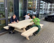 Vom Baum zur Tisch-Bankkombination Die Teilnehmer der KoBV, Patrick,Robin und Giuliano, sind stolz auf ihre Arbeit. Die Arbeit